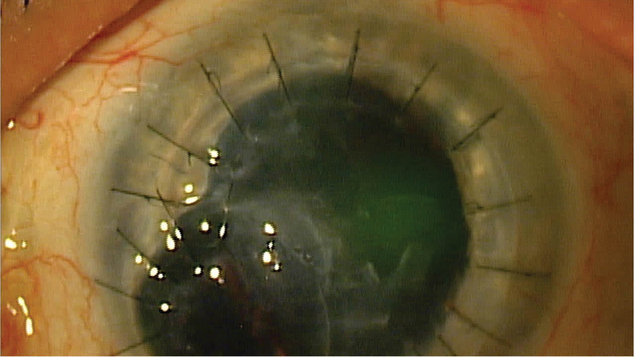 Recently, an 80-year-old male was referred for management of microbial keratitis (MK). He was left with a dense central scar. Following a very complex path over several years, this patient experienced a penetrating keratoplasty (PKP), a micrograft following a microperforation, two Descemet’s stripping endothelial keratoplasties, cataract surgery, non-healing epithelial defects (resolved with a dehydrated amniotic membrane ap-plied under a scleral contact lens), and IOL expulsion in the setting of open globe trauma. Despite these issues, the patient achieved 20/50 with scleral contact lens application. (Figure 1.)